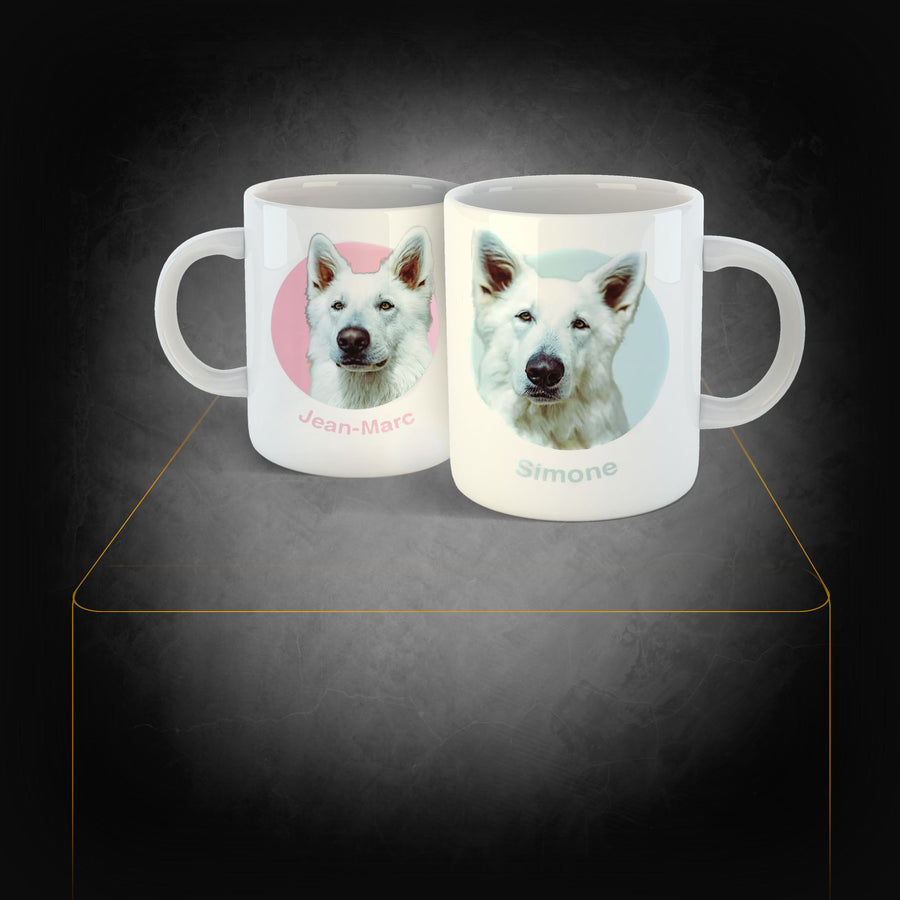 A large portrait photo of the dog Jean-Marc is printed in a circular way in a candy pink background on a first mug. On the second mug find a large portrait photo of the dog Simone printed in a circular way in a light blue background. These two beautiful dogs refer to his latest album. Brighten up your coffee breaks with our pastel mug!