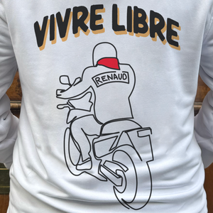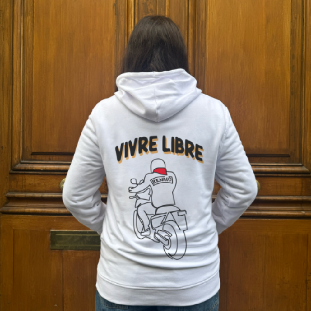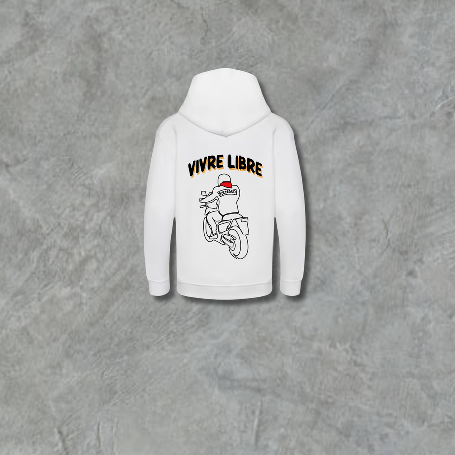 Ce sweat à capuche blanc met en avant une illustration saisissante de Renaud sur sa mob' accompagnée du message "Vivre Libre" imprimée au dos, symbolisant la liberté sans compromis. À la fois sobre et percutant, son design unique incarne parfaitement l’esprit de ceux qui vivent sans règles imposées, prêts à embrasser l’aventure et la nouveauté à chaque instant.